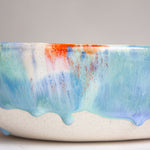 Glazed in bright orange, blue, green and purplish white.