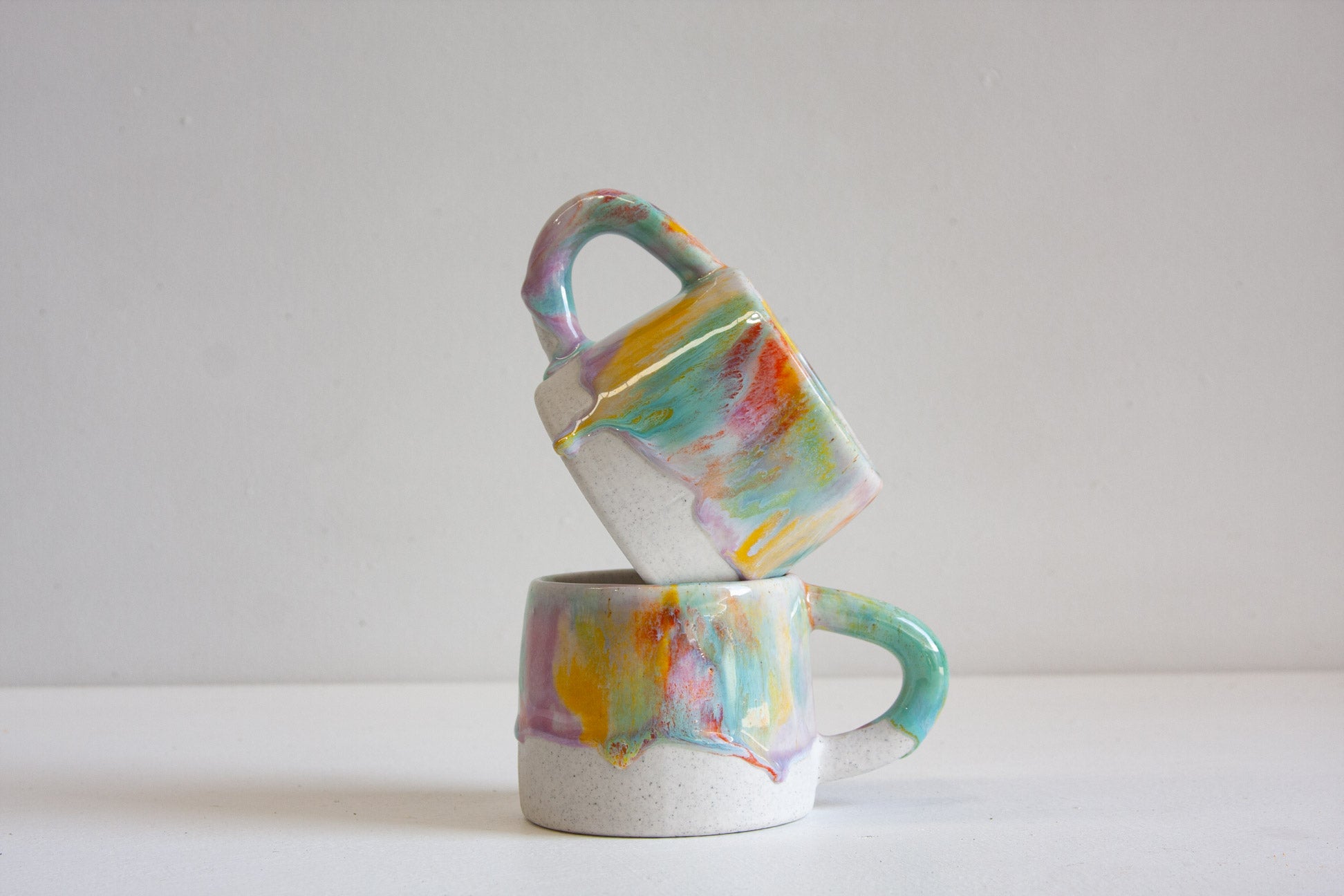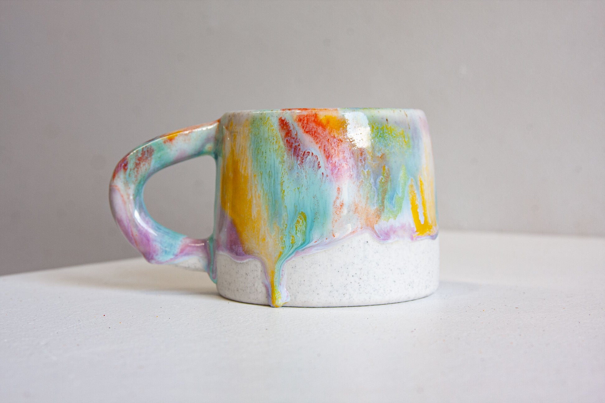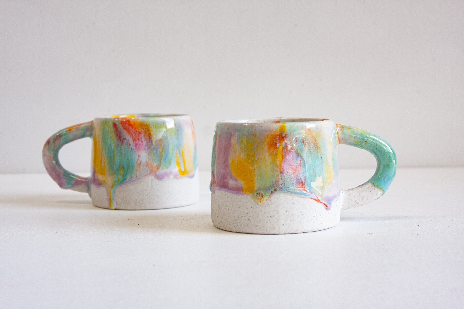 These mugs have been handmade using a white speckled clay and glaze in multiple colours such as, purple yellow, orange, green and white.
