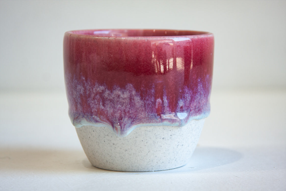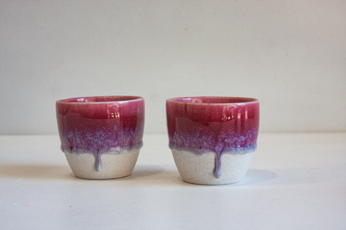 These handmade ceramic cups have been made using a speckled white clay and have been glazed in deep pink.