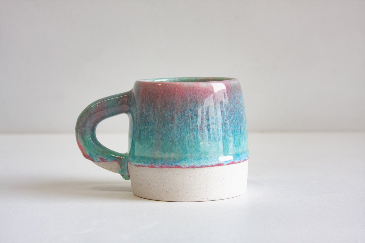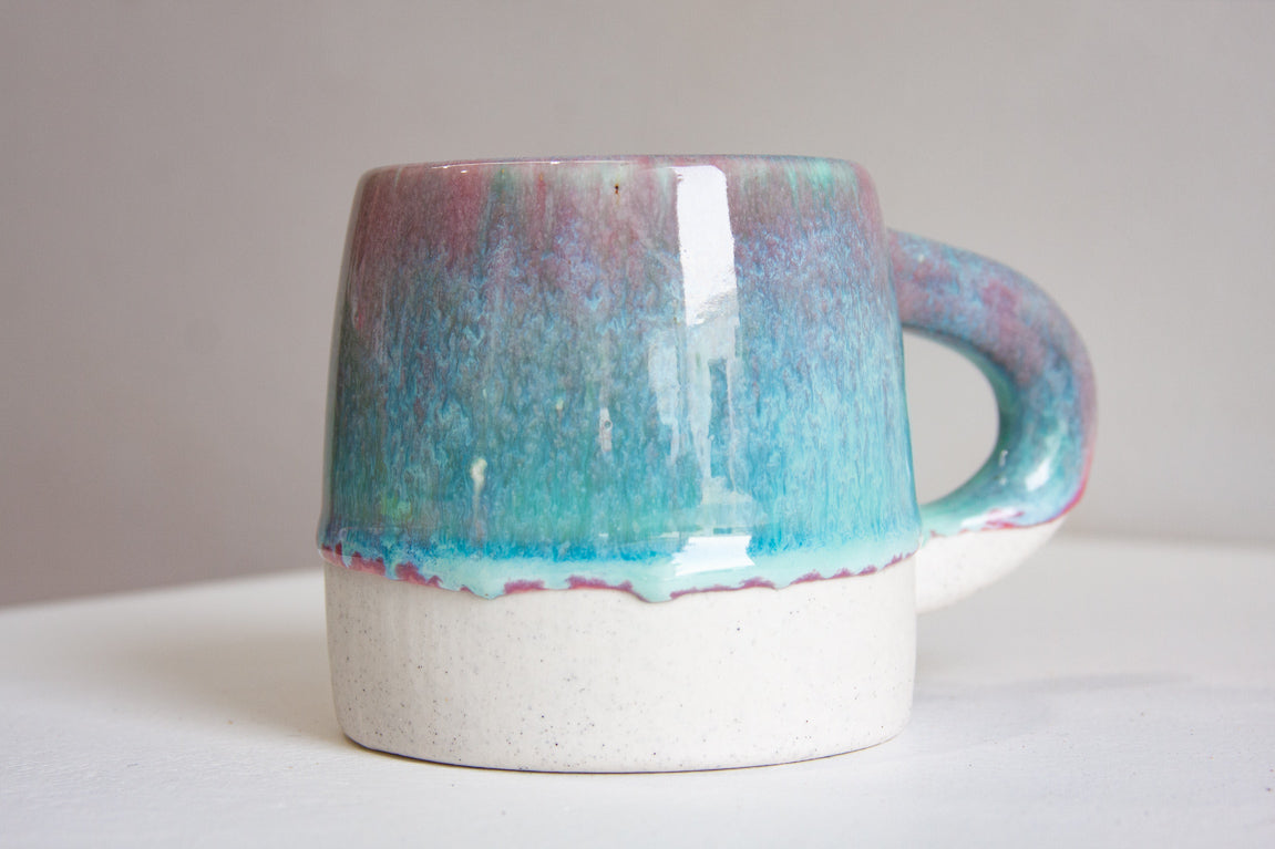 The variegation on each cup is unique in this colour range, as is the amount of fluidity from the glaze. Some mugs have more pink, more blue or white glaze.