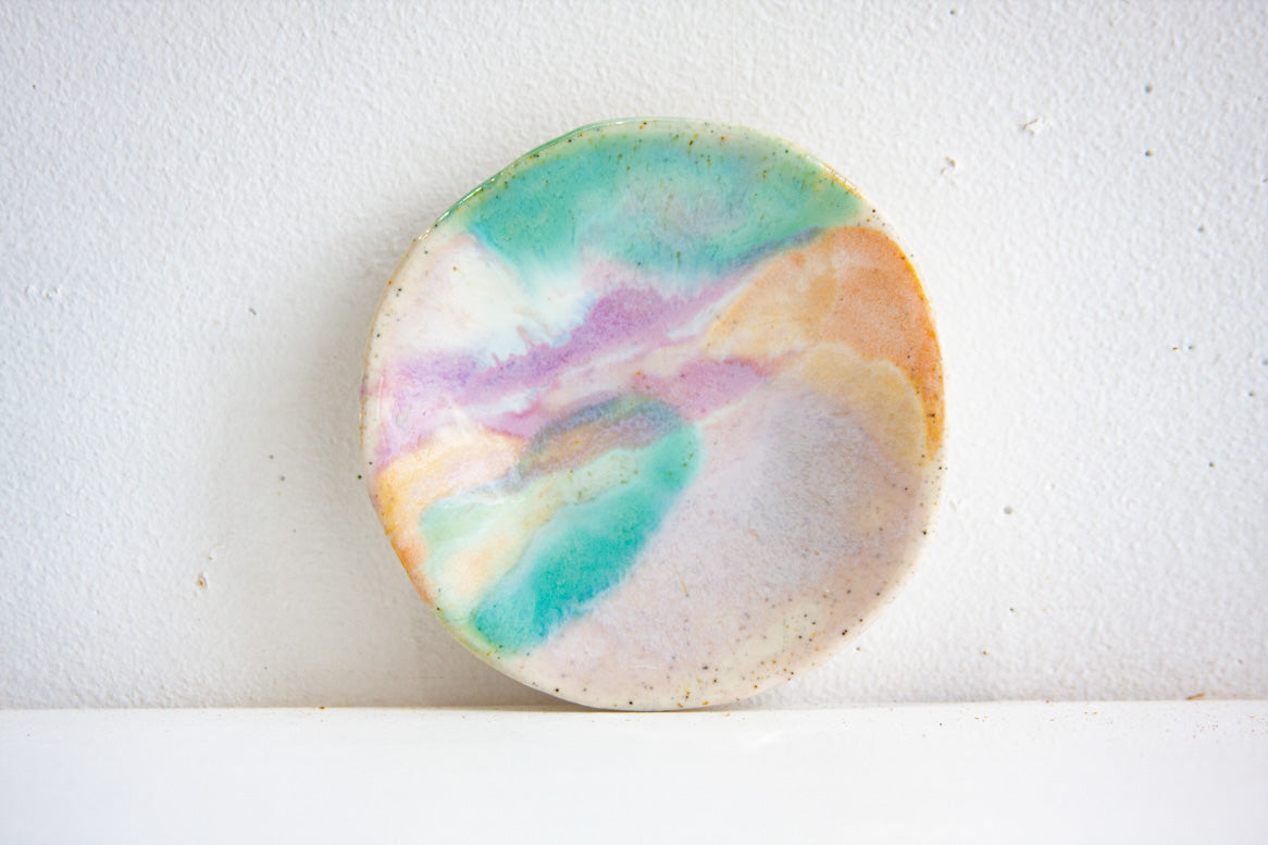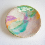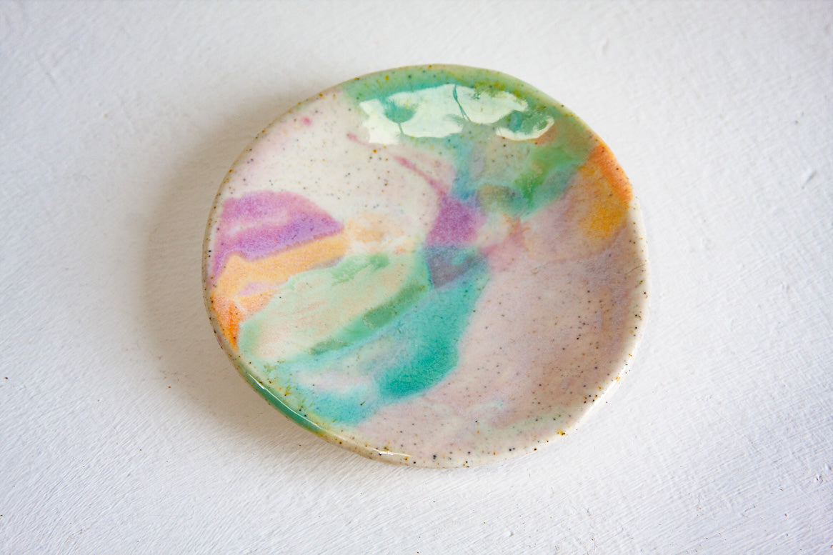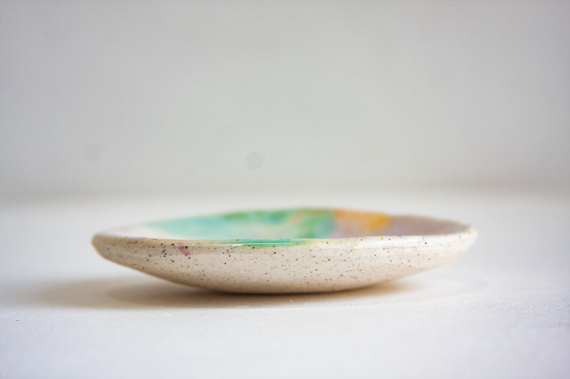 This handmade mini plate has been made with a speckled white speckle clay and glazed in green, purple, blue and peach