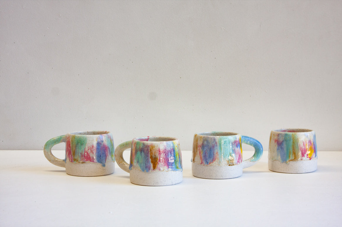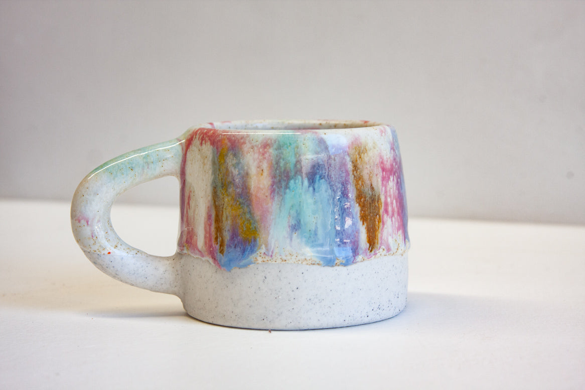 Glazed in a white, yellow, pink, blue and green.
